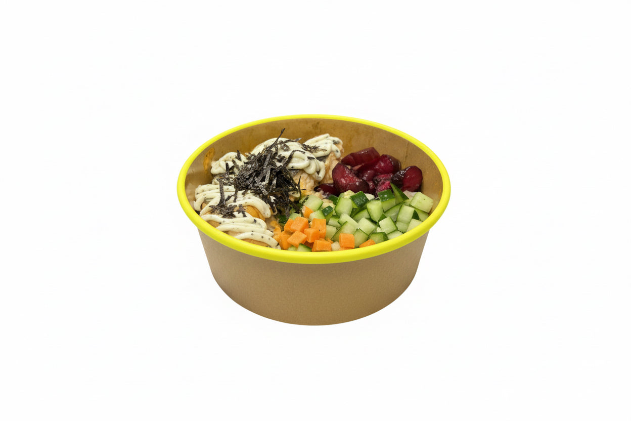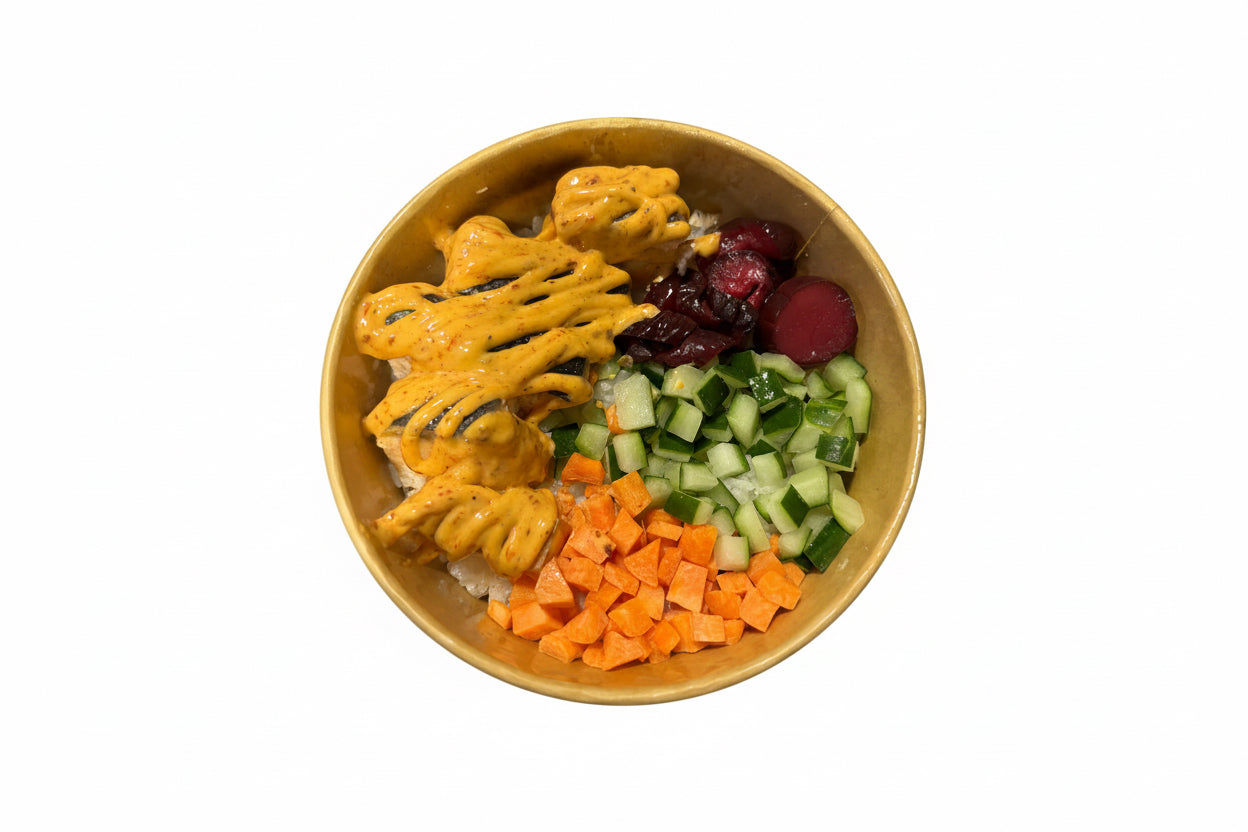 The Salmon Donburi is a carefully prepared pan-fried salmon rice bowl, accompanied by a selection of assorted vegetable sides. Rich in omega-3 fatty acids, salmon contributes to heart health, while the vegetables provide essential vitamins and minerals, enhancing overall nutritional value. This dish offers a balanced meal option, promoting well-being.